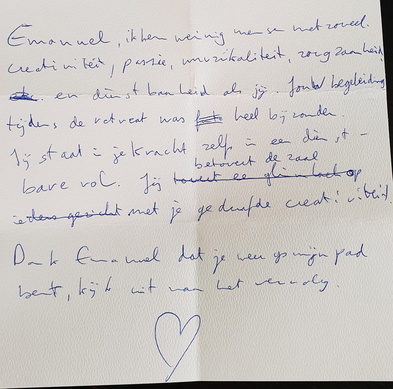 Emmanuel, ik ken weinig mensen met zoveel creativiteit, passie, muzikaliteit, zorgzaamheid en dienstbaarheid als jij. Jouw begeleiding tijdens de retreat was heel bijzonder. Jij staat in je kracht zelfs in een dienstbare rol. Jij betovert de zaal met je gedurfde creativiteit.